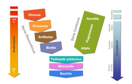 A série continua, a das plagióclases, tem início nas plagioclases cálcicas (anortite), passando pelas calco-sódicas até às plagióclases sódicas (albite). No final, a temperaturas mais baixas, ocorre a cristalização dos feldspatos potássicos (ortóclase), da moscovite e do quartzo que não pertencem a nenhuma daquelas séries. Na série continua, os minerais apresentam o mesmo tipo de estrutura cristalina. A série descontínua é assim chamada porque cada mineral tem estruturas cristalinas e composição química diferentes.